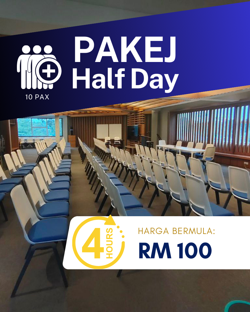 Sewaan dewan kami dikira setiap 4 jam untuk setiap sesi, dan setiap pakej disesuaikan untuk 10 peserta. Ini memberikan fleksibiliti kepada anda untuk merancang acara anda mengikut keperluan anda.